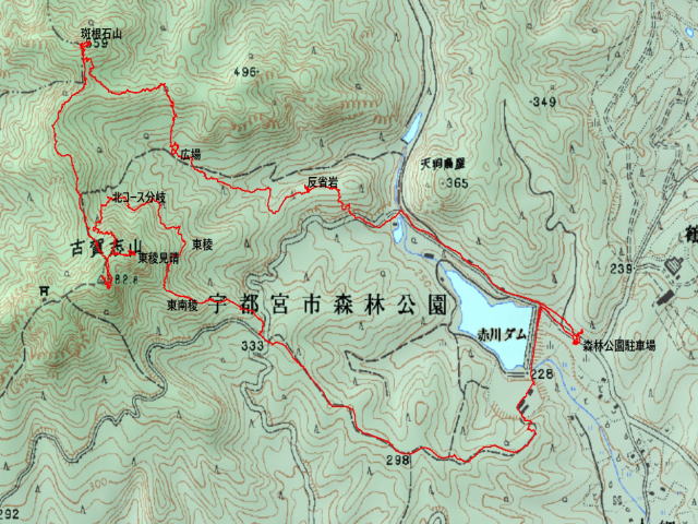 森林公園駐車場−−反省岩−−広場−−斑根石山−−古賀志山−−東稜見晴−−北コース分岐−−東稜−−東南稜−−駐車場