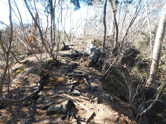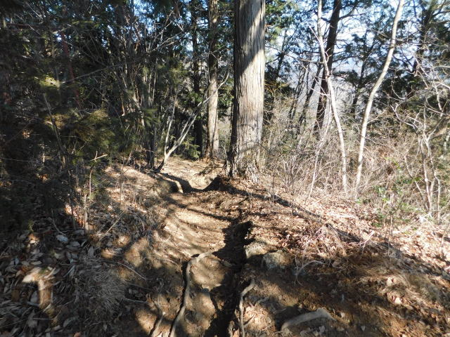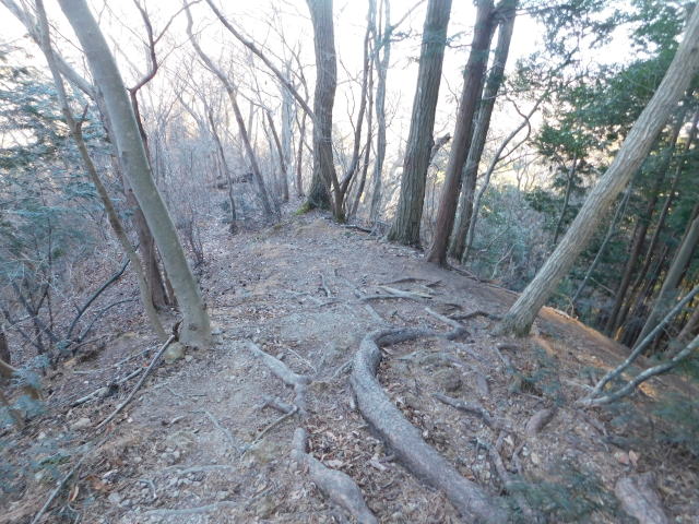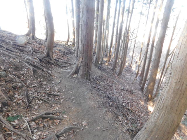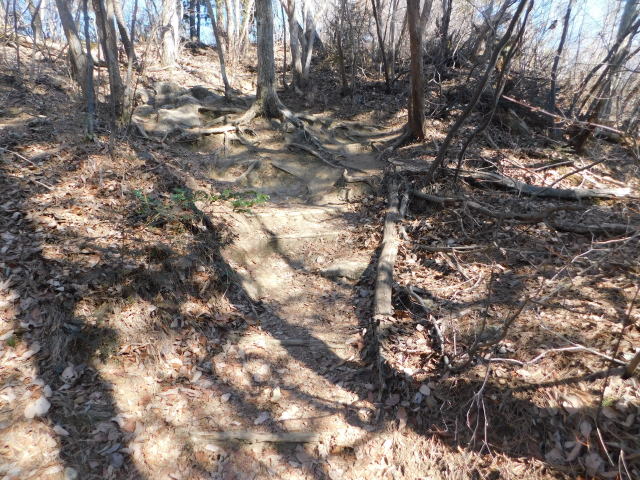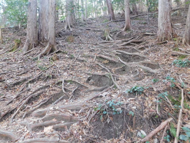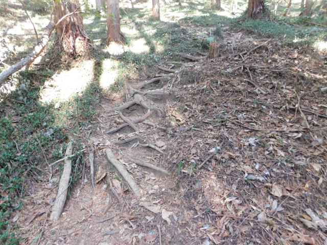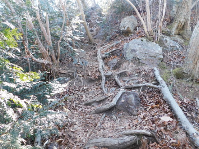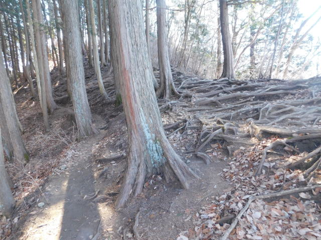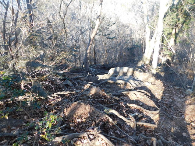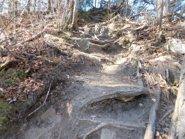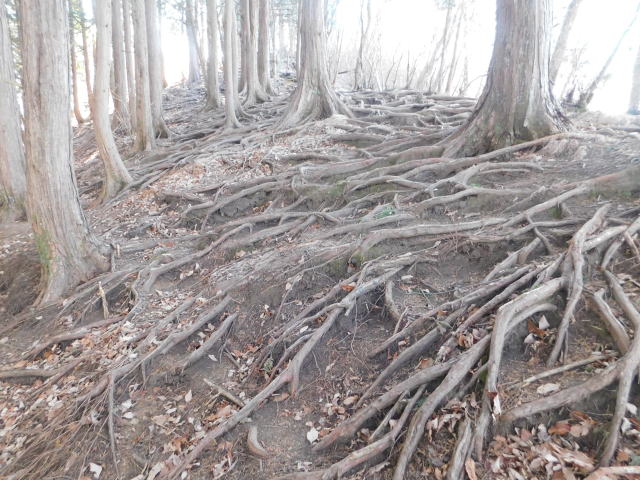 古賀志山頂は木の根の斜面。