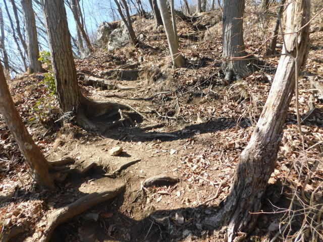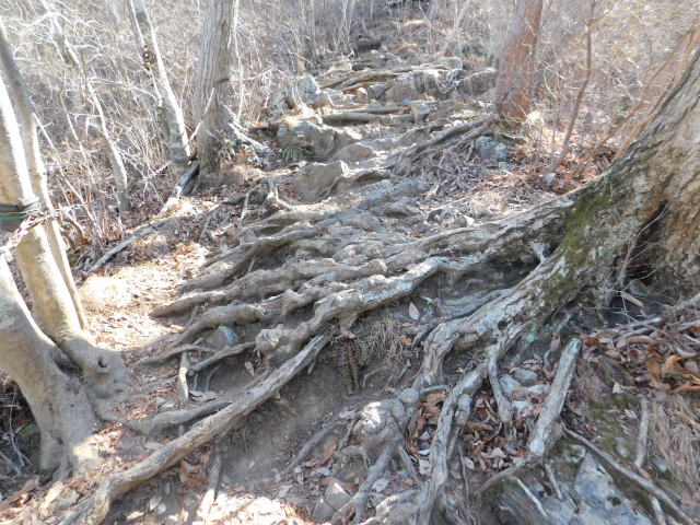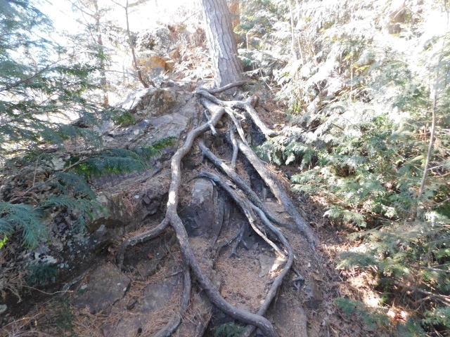 木の根の斜面を登って行く。