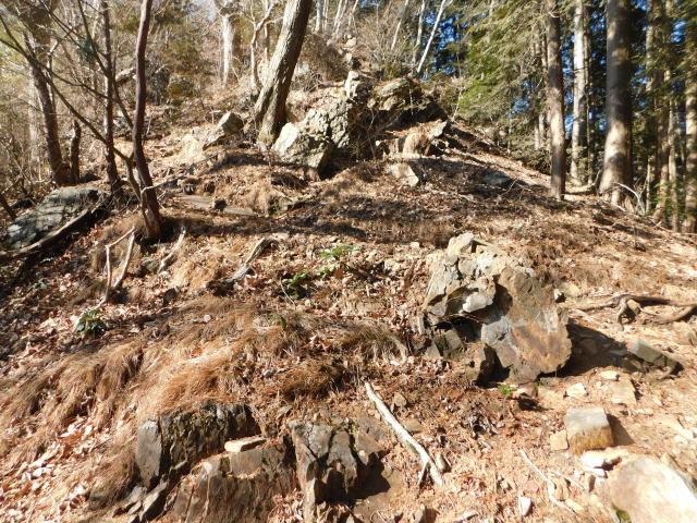 岩の多い斜面を登る。