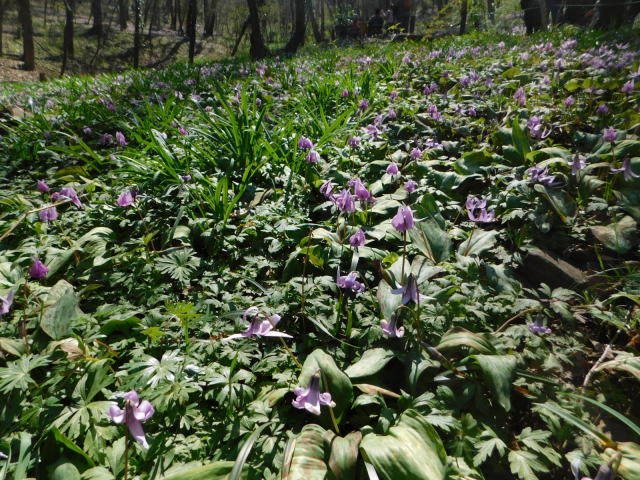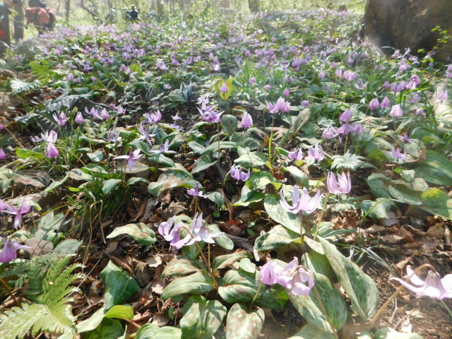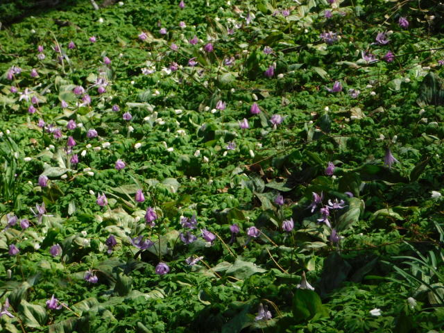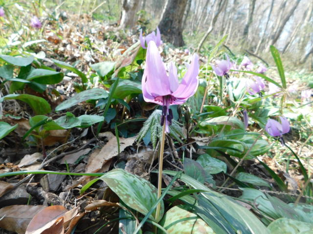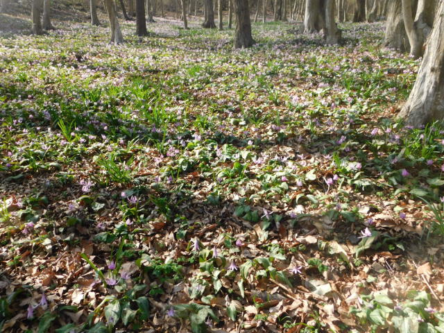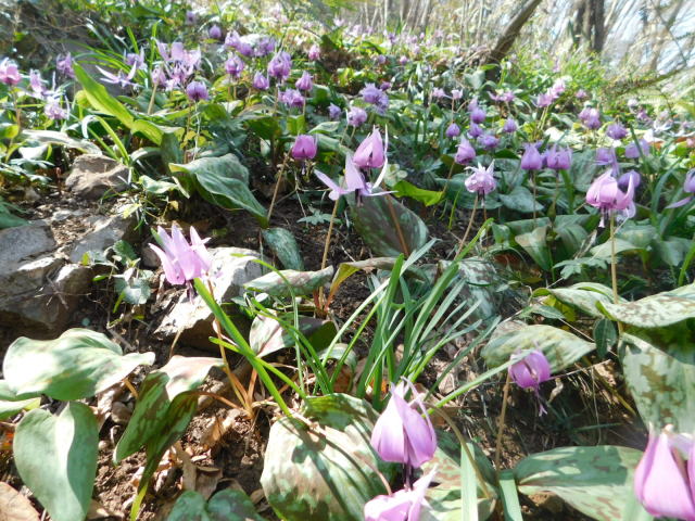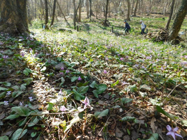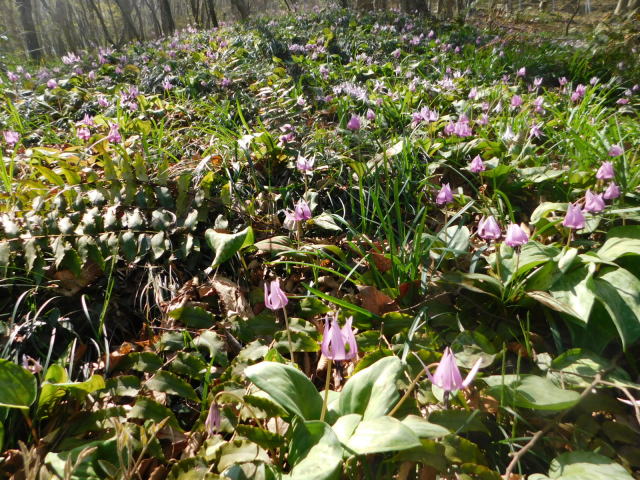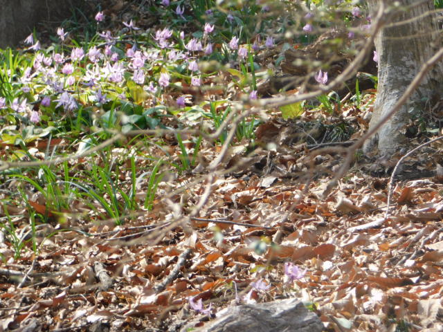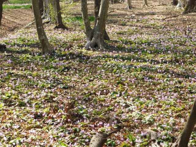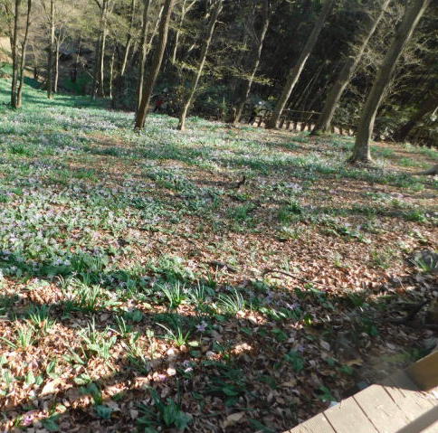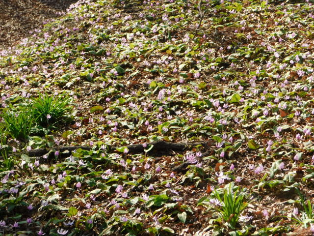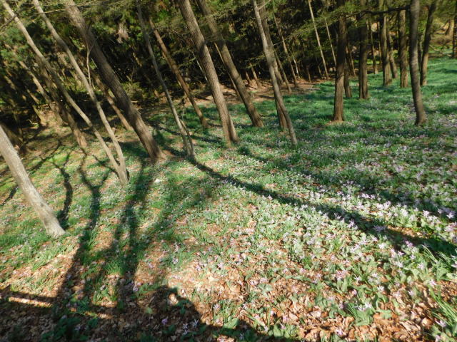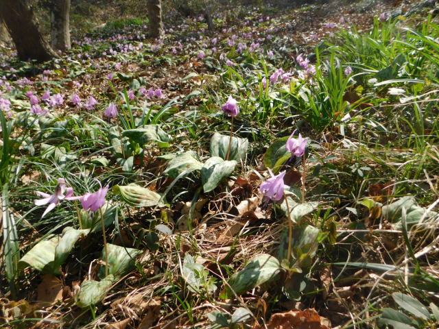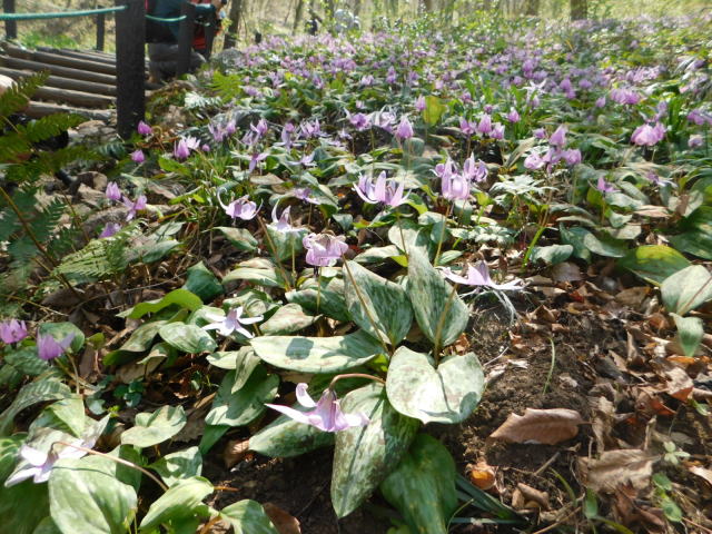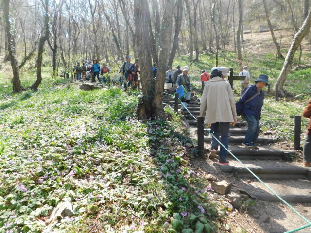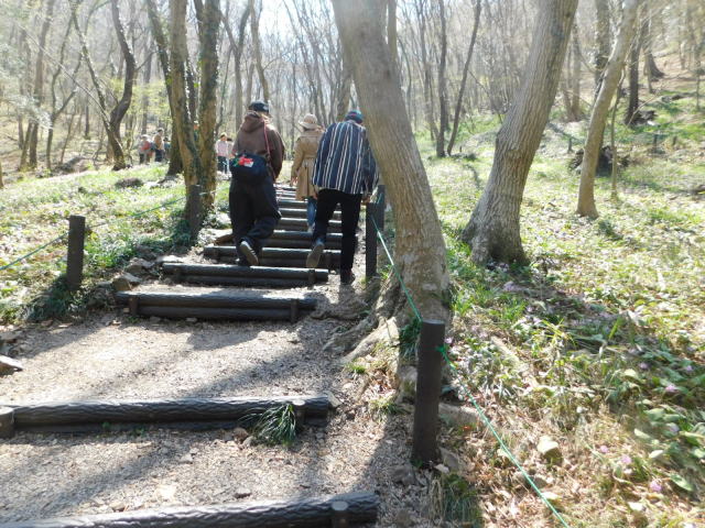 ある。扉を入るとカタクリ咲く斜面の階段の道になる。カタクリの写真を撮りながら階段を降りて行く。下の扉を出て、ベンチが並んだ所でカップ麺の昼食とする。昼食後下の扉を