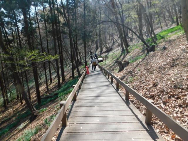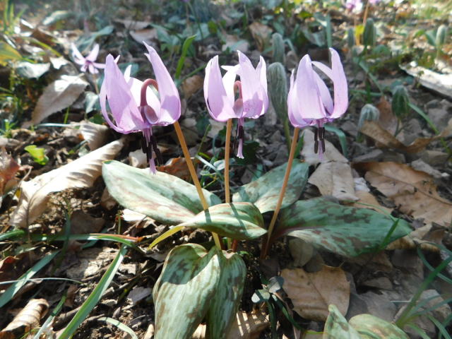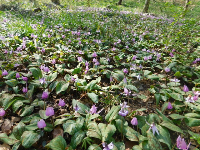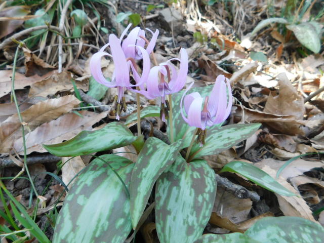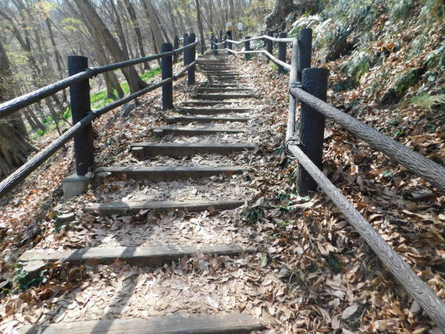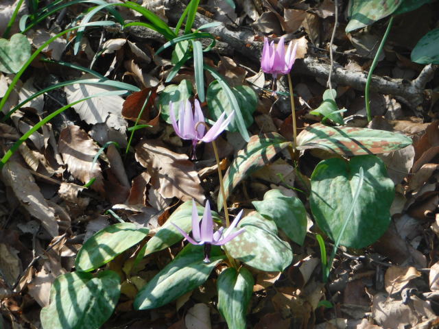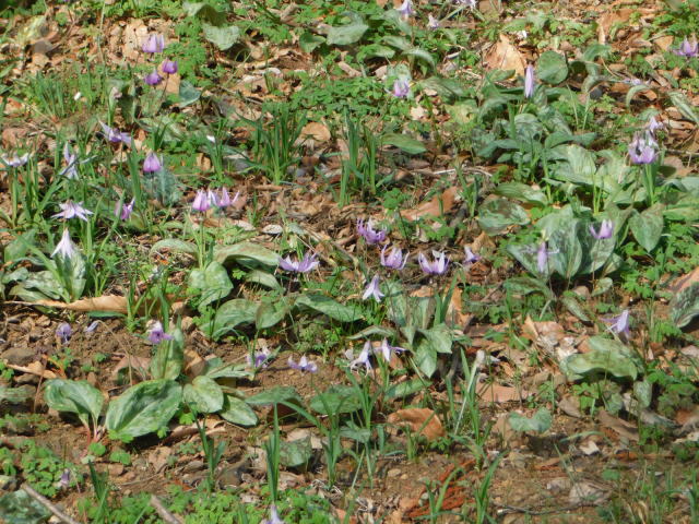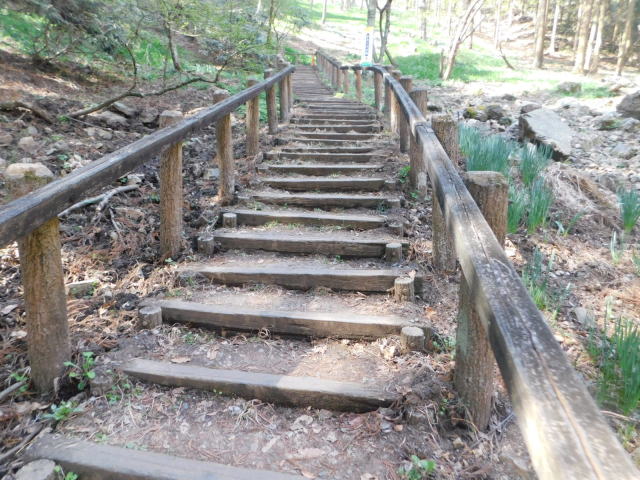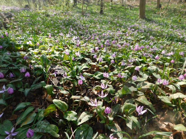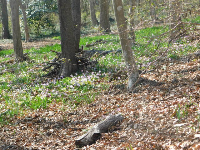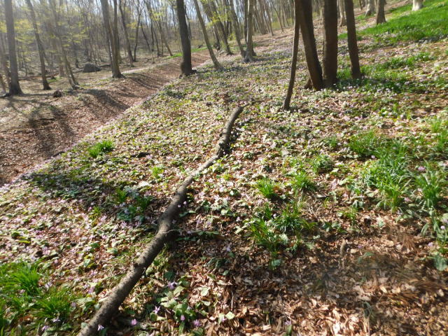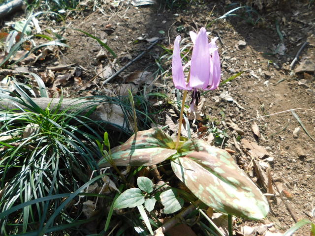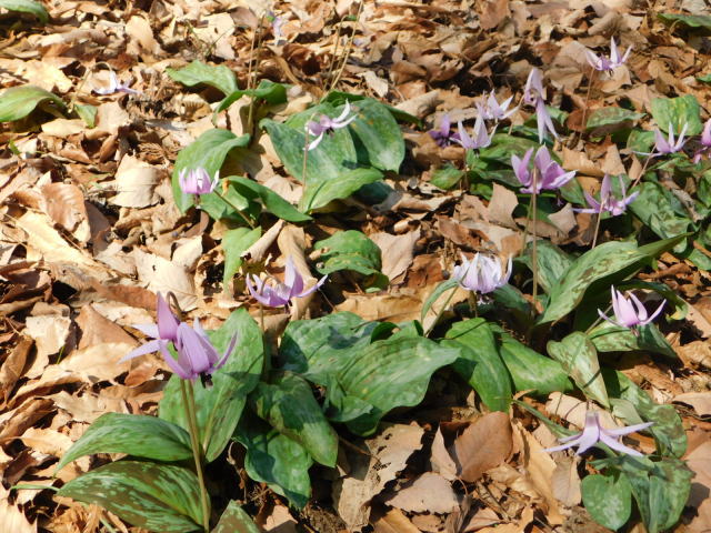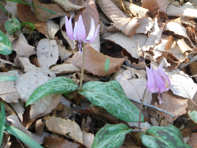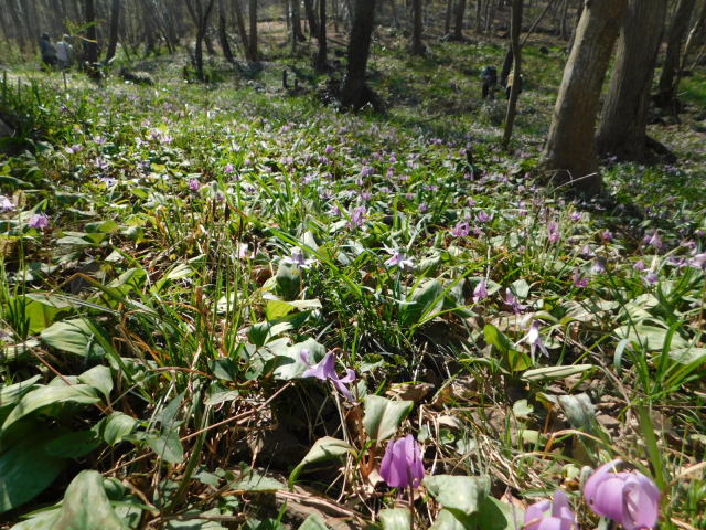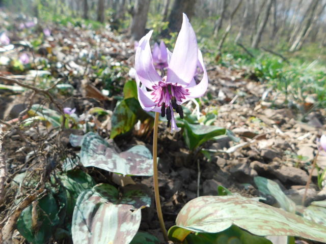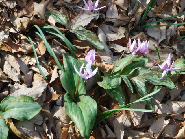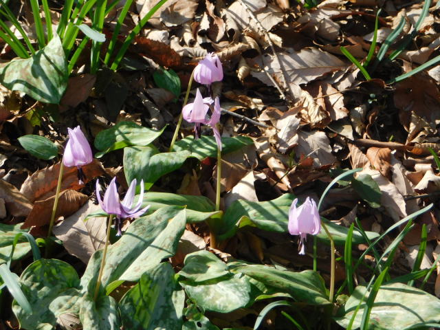 ある。扉を入るとカタクリ咲く斜面の階段の道になる。カタクリの写真を撮りながら階段を降りて行く。下の扉を出て、ベンチが並んだ所でカップ麺の昼食とする。昼食後下の扉を