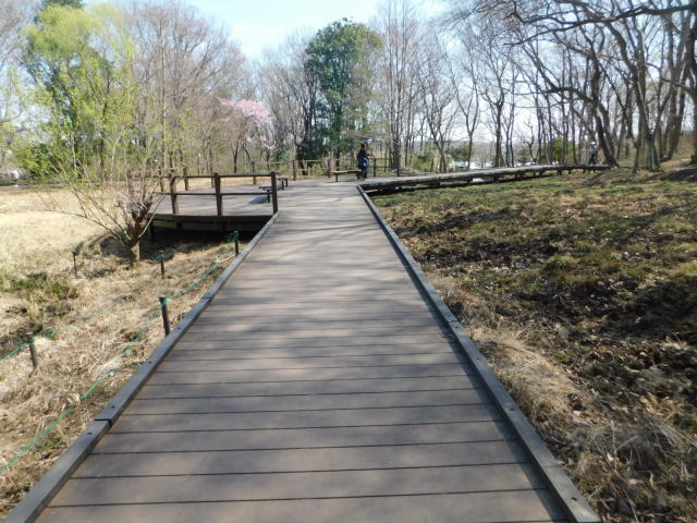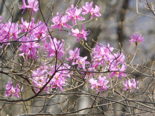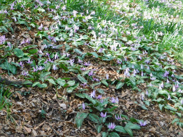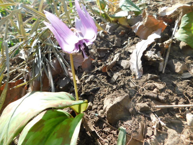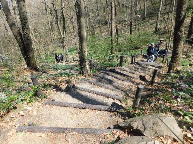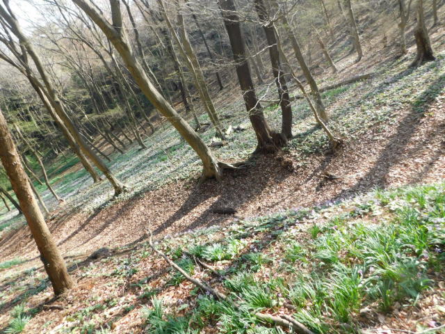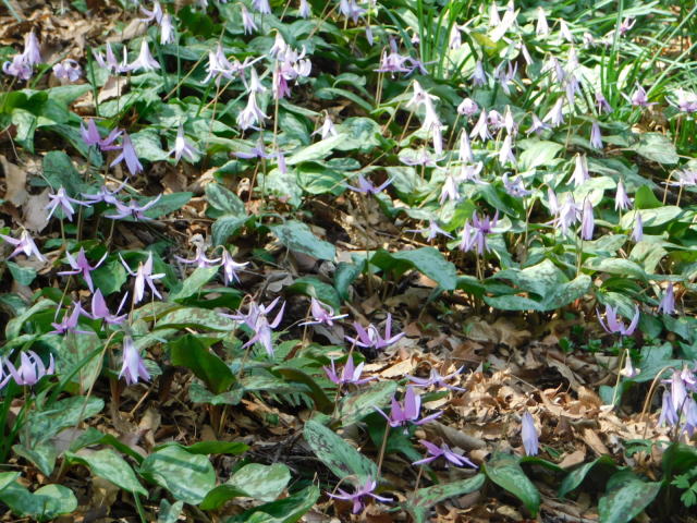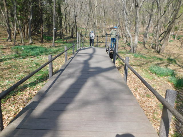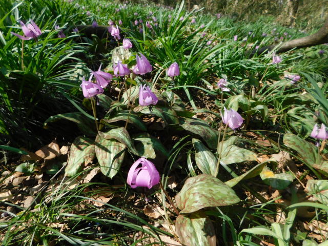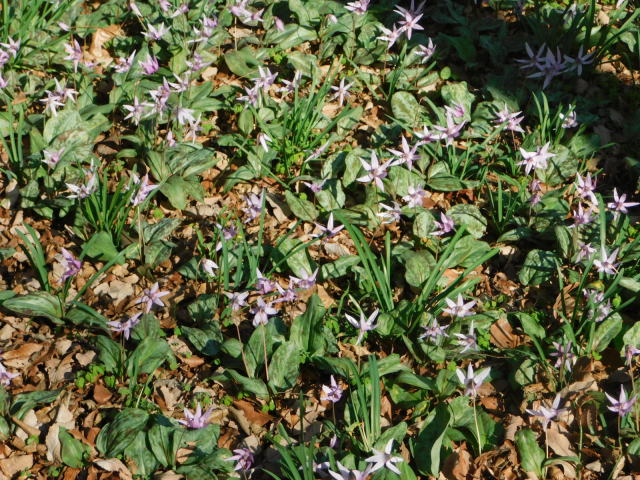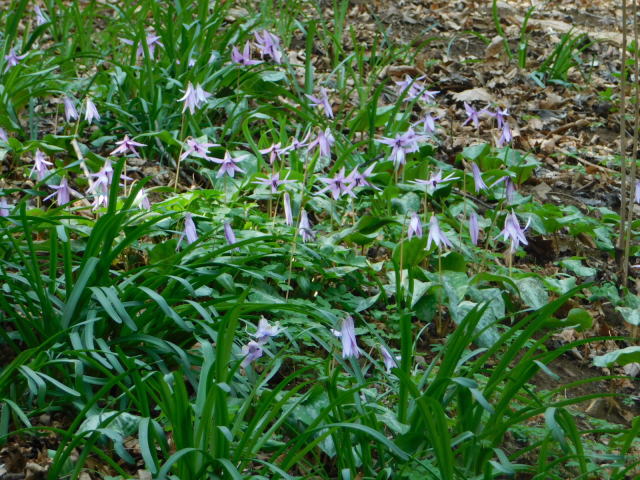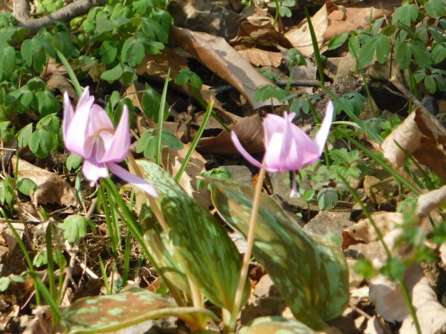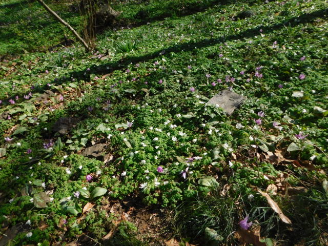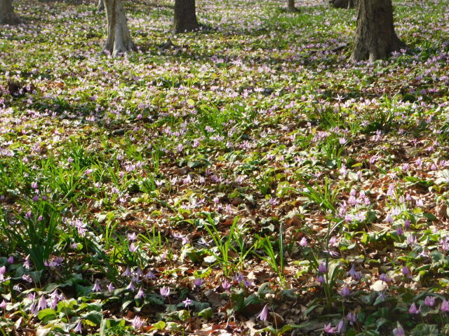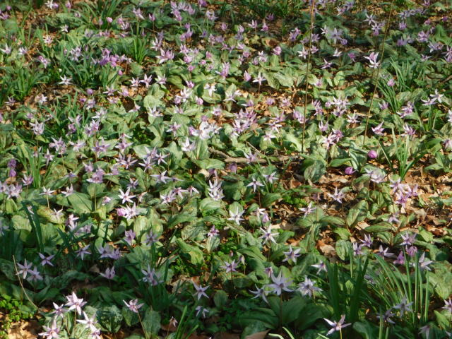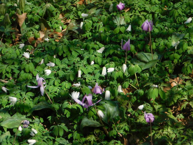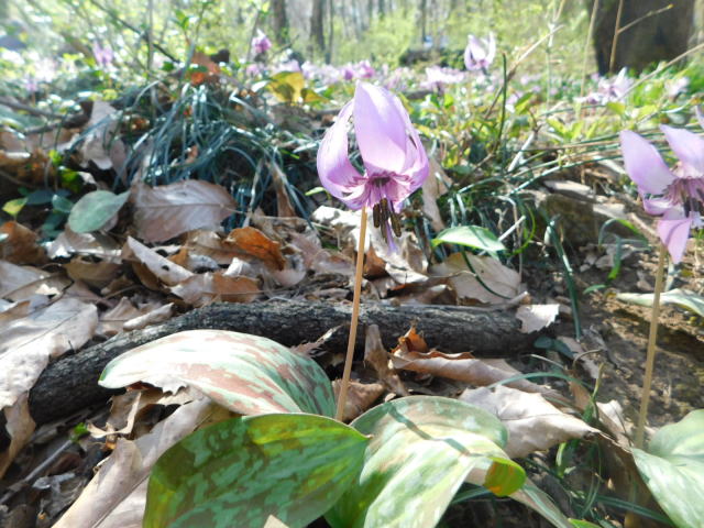 ある。扉を入るとカタクリ咲く斜面の階段の道になる。カタクリの写真を撮りながら階段を降りて行く。下の扉を出て、ベンチが並んだ所でカップ麺の昼食とする。昼食後下の扉を