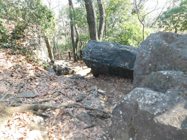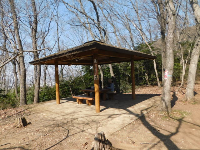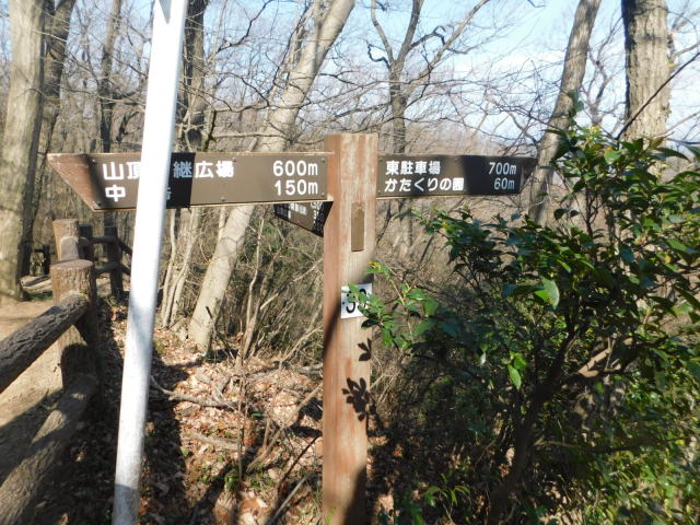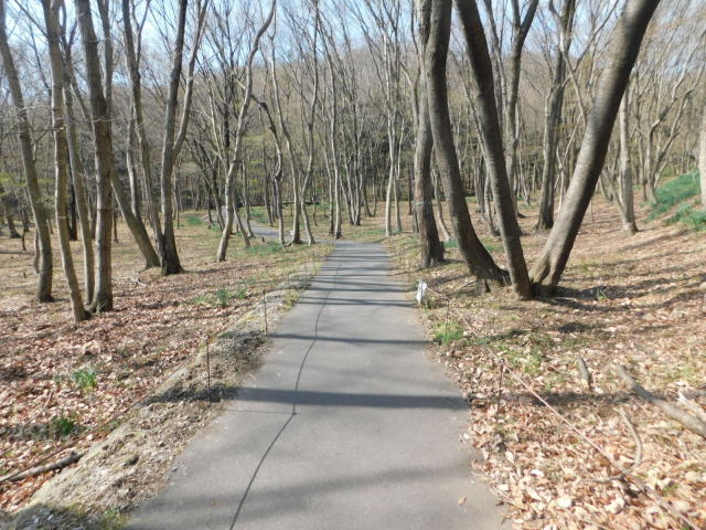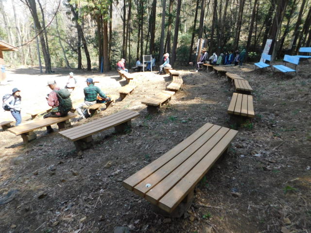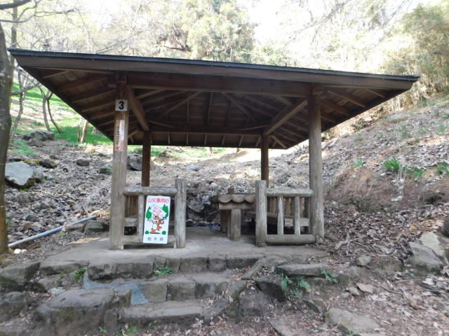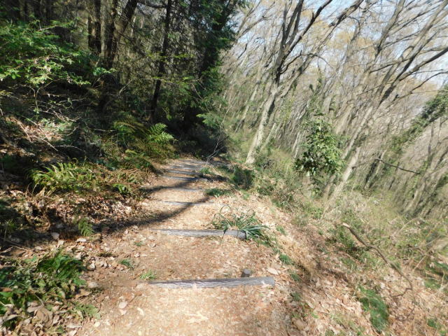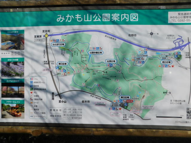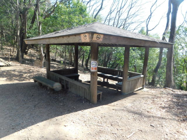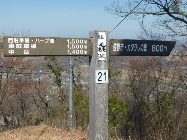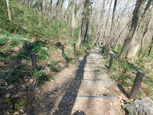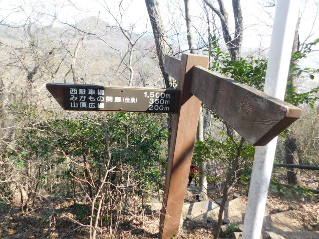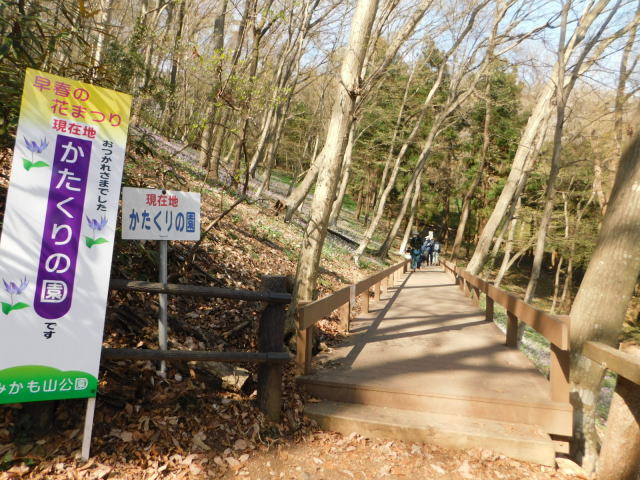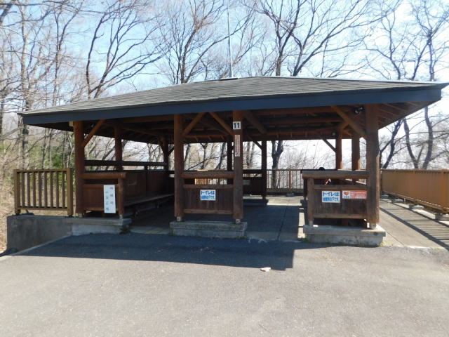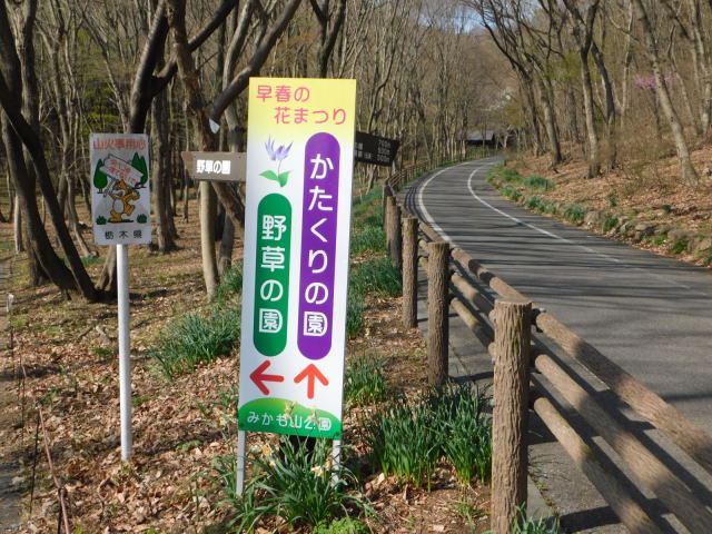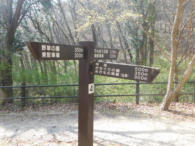 があった。上の展望台からのカタクリ咲く斜面を眺めて行く。階段を登って中岳には行かず山頂広場へ行く。山頂広場の東屋で一休みする。山頂広場からみかもの関跡へ行き