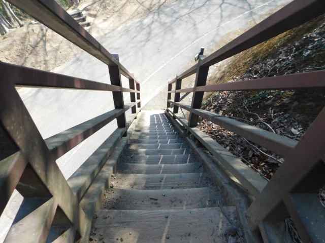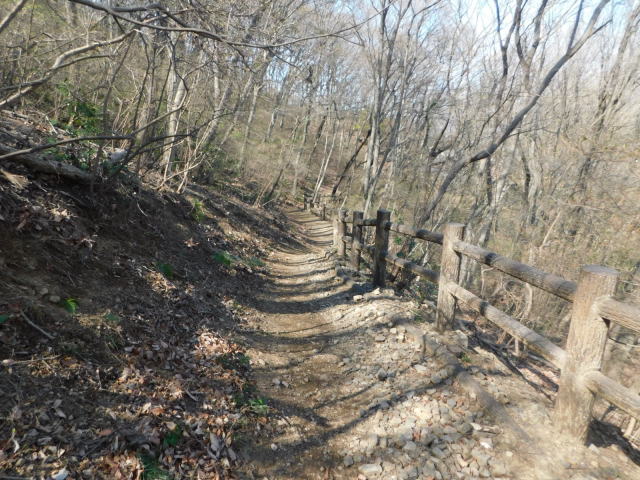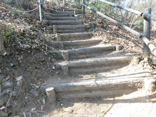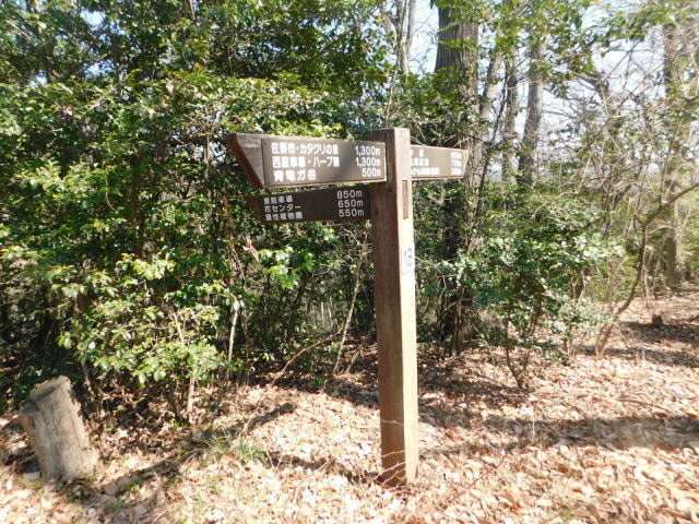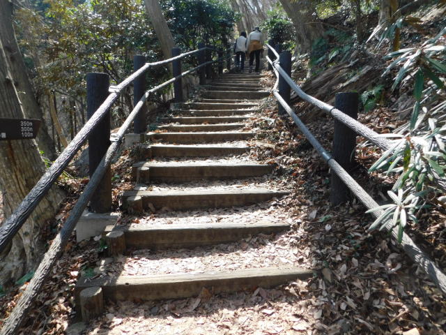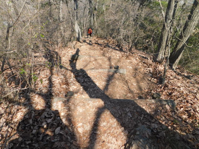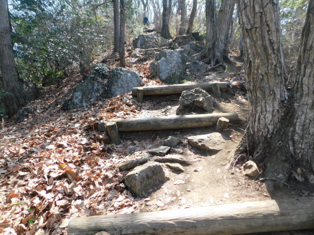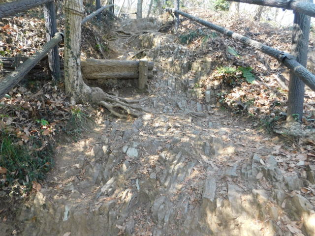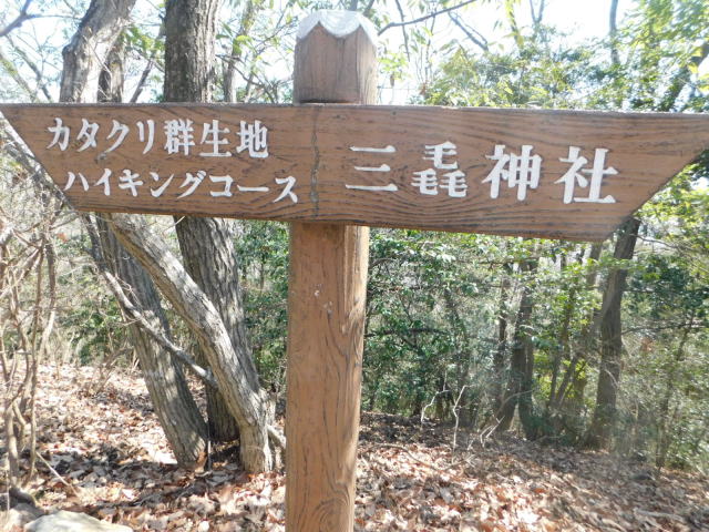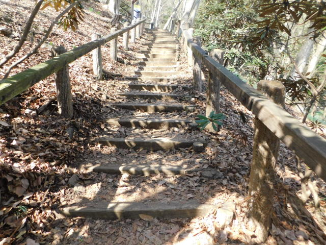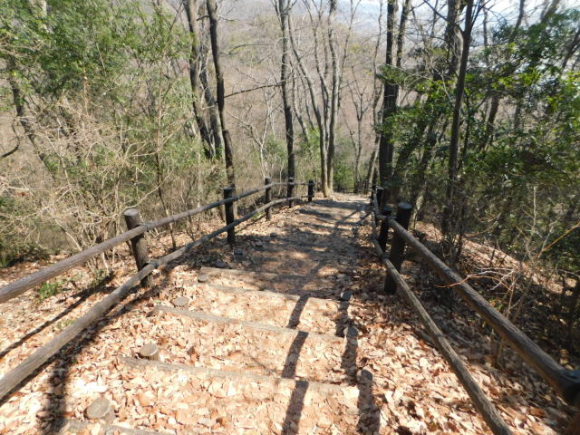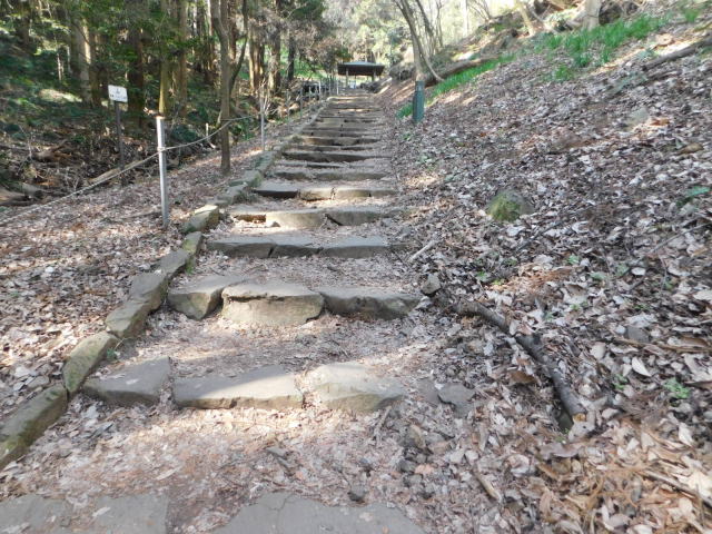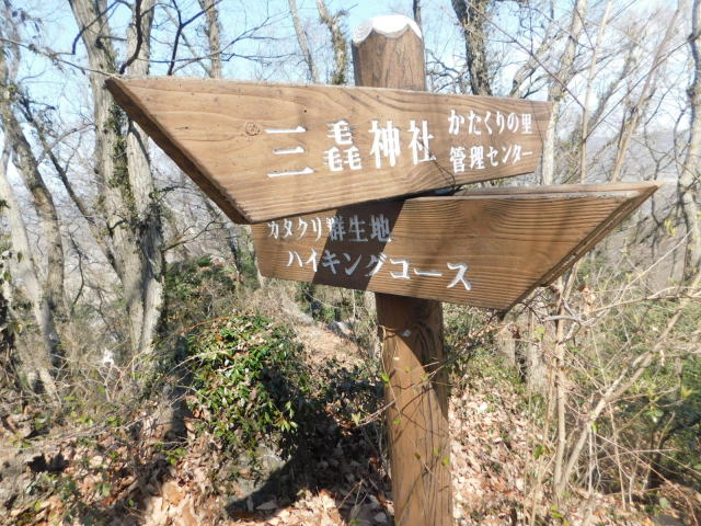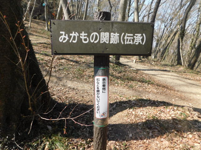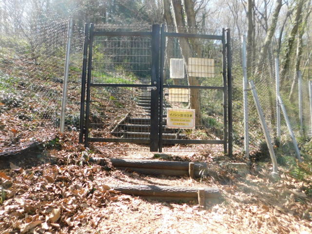 みかもの関跡から青竜ヶ岳に行く。青竜ヶ岳の急斜面の階段の登りは脇の階段でない急斜面を登って行く。青竜ヶ岳を降りてかたくりの里へ行く。かたくりの里の入口は扉が
