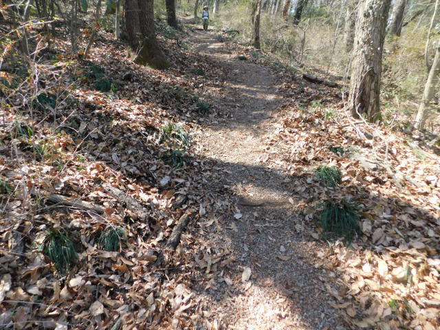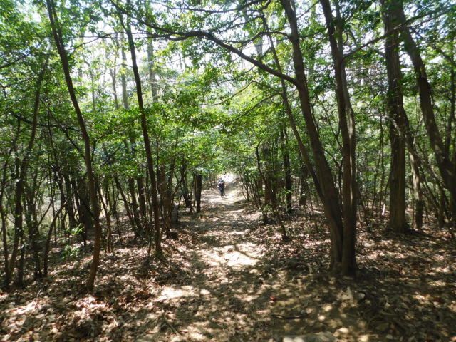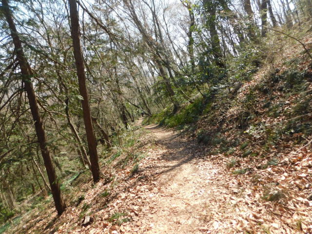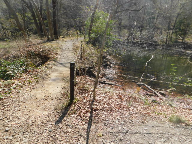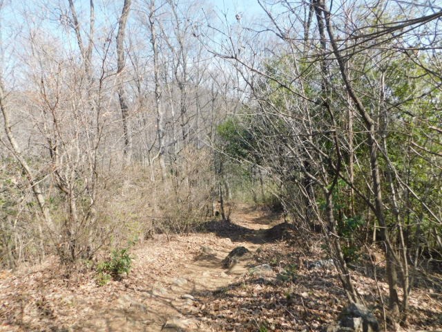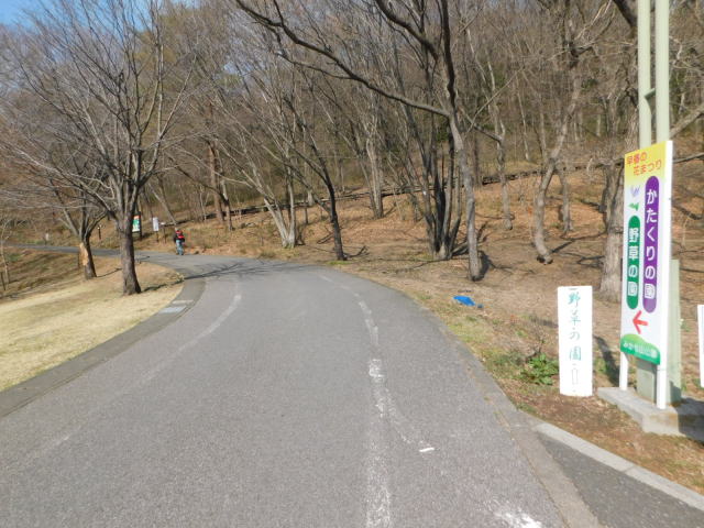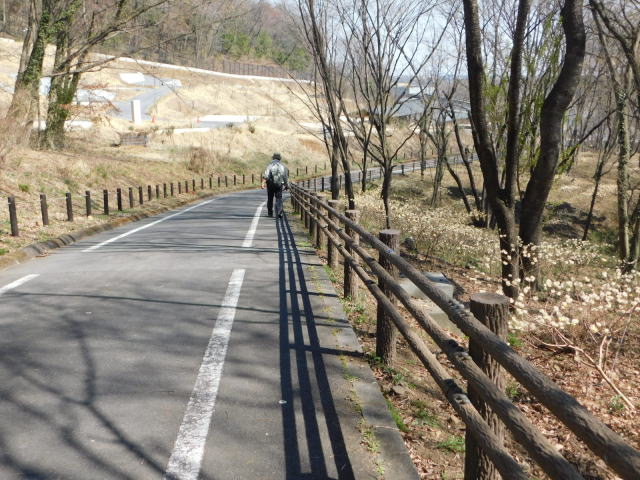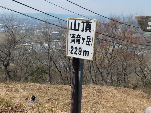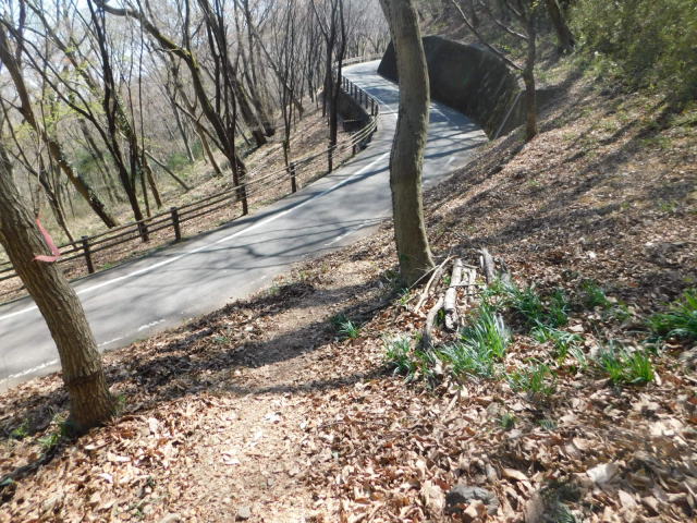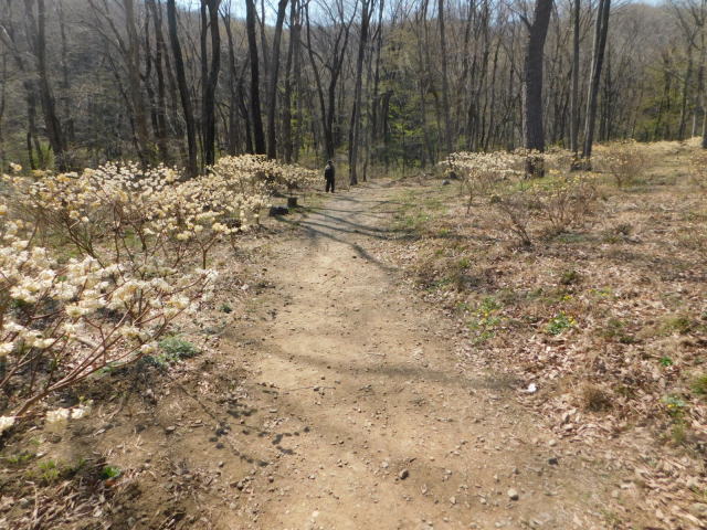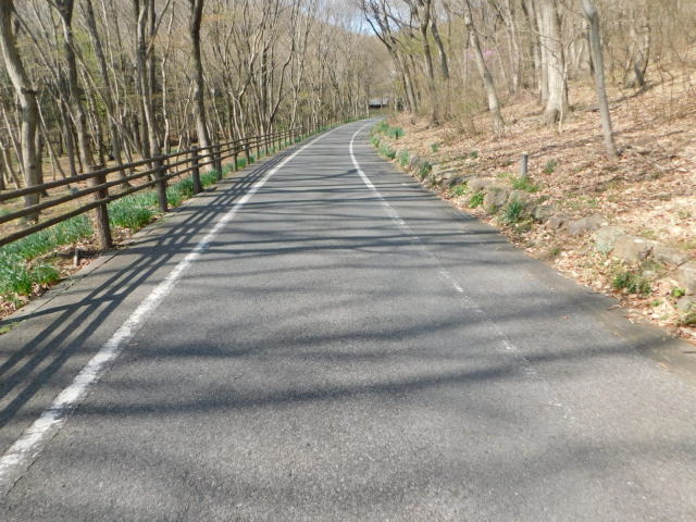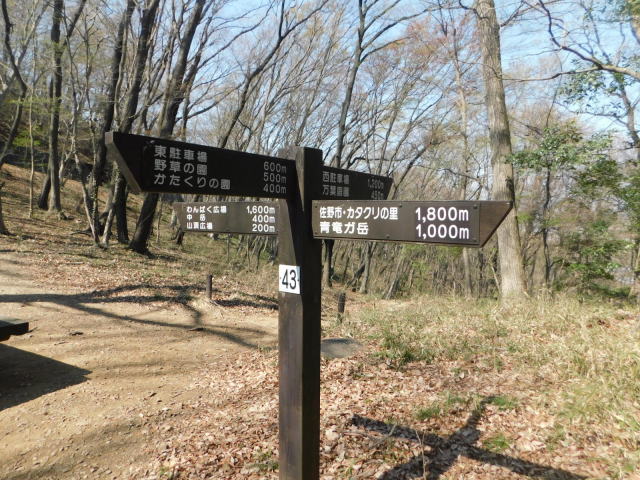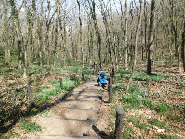 入って、カタクリの写真を撮りながら階段を登って行く。上の扉を出て、青竜ヶ岳に登る。青竜ヶ岳を降りて、東屋のある東駐車場分岐から東駐車場に降りて行く。下の道路に出て