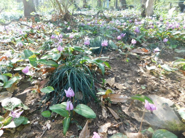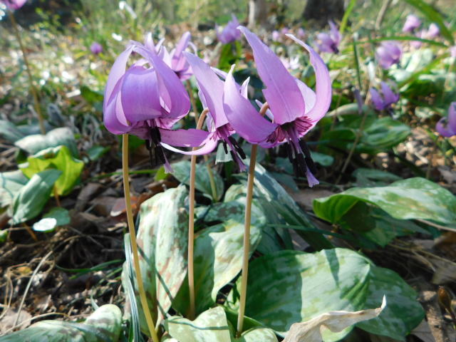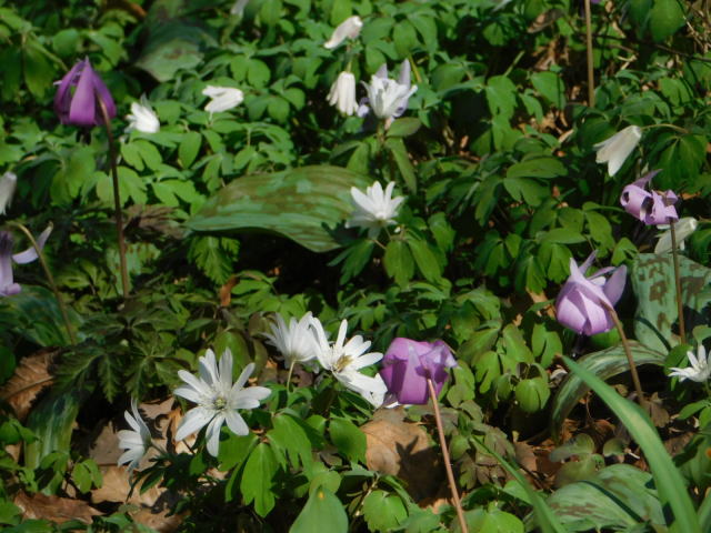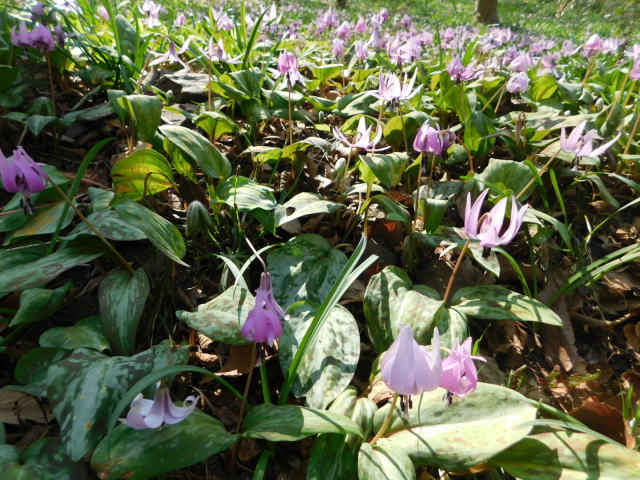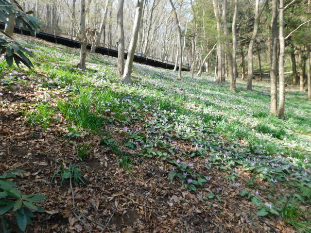 野草の園のカタクリの花は開いていたがアズマイチゲの花は閉じていた。かたくりの園のカタクリの花は半分ぐらいが開いていた。展望台から眺めるカタクリ咲く斜面は見応え