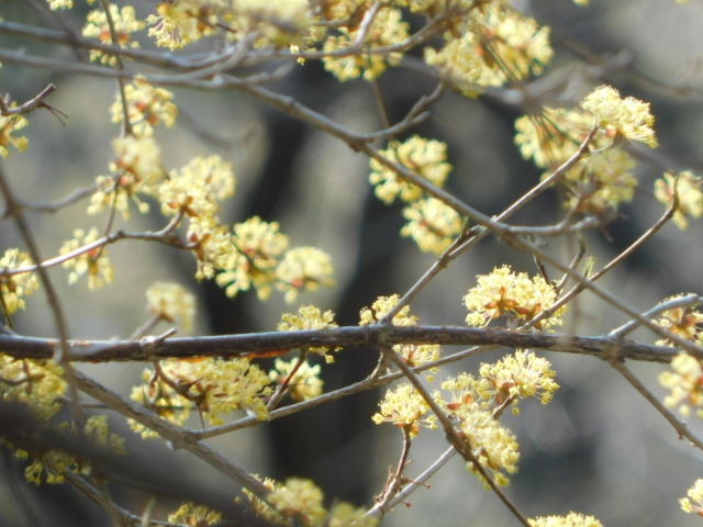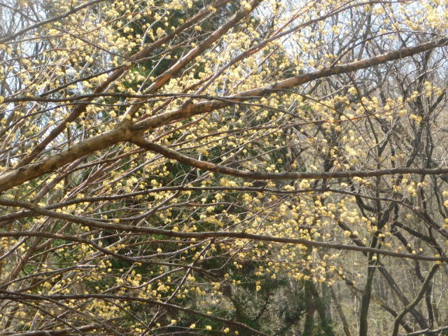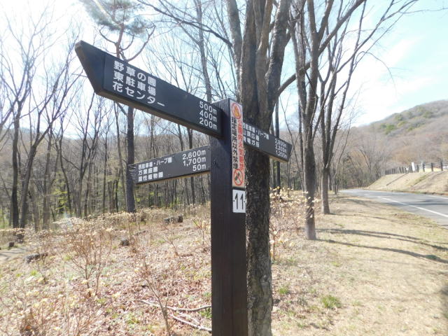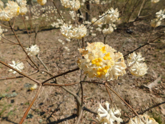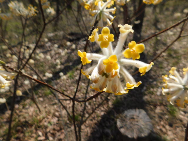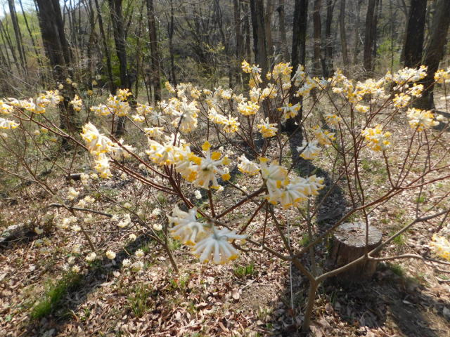 道路を降りて行くと右側はミツマタの群生地になっている。ミツマタ群生地を通り、湿性自然植物園へ行く。湿性自然植物園から駐車場に戻る。午後1時2分の駐車場は満車に