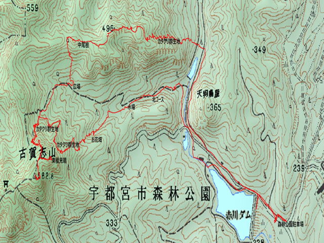 森林公園駐車場−−お花畑−−東稜岩−−北コース分岐−−古賀志山−−東稜見晴−−広場−−中尾根−−カタクリ群生地−−駐車場