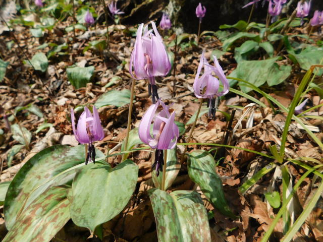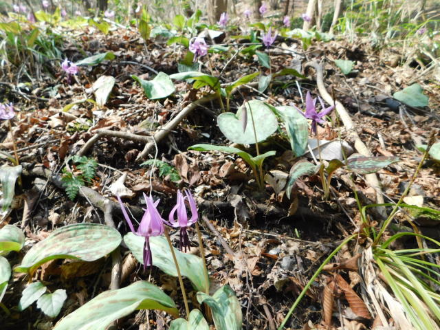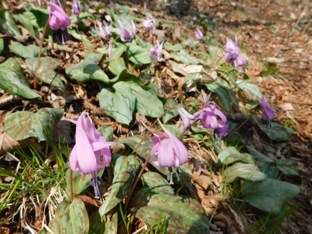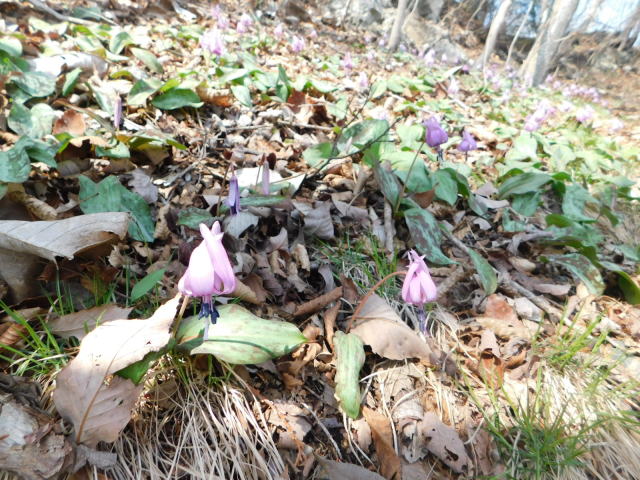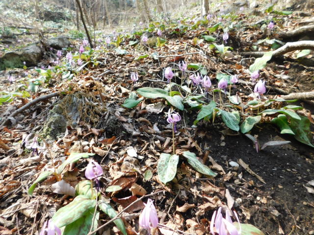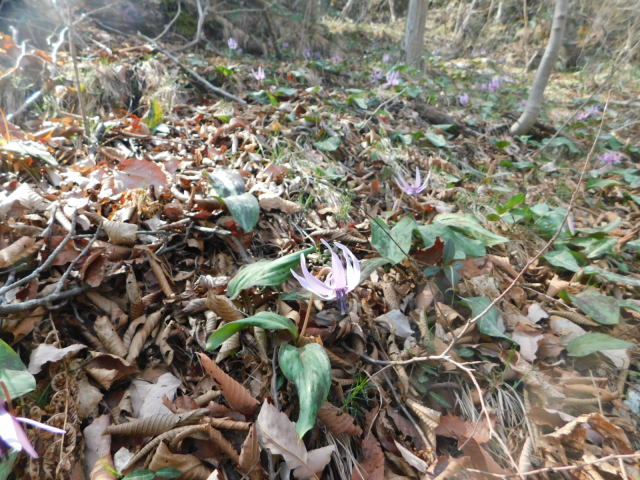 カタクリ咲く斜面を降りて行く。