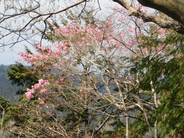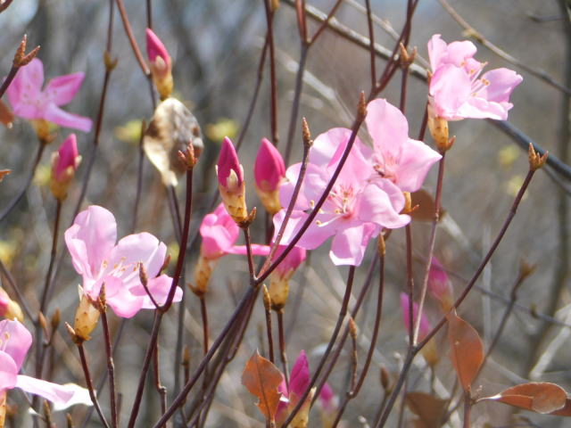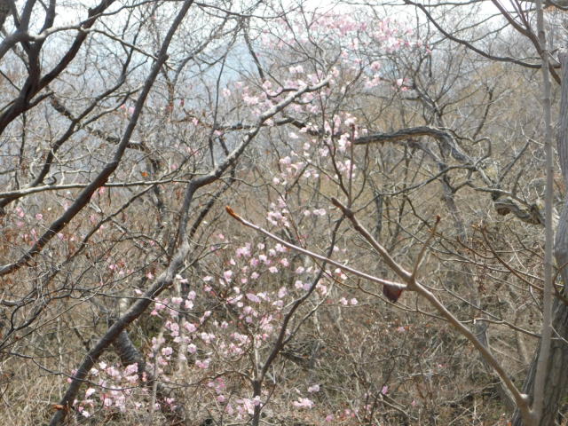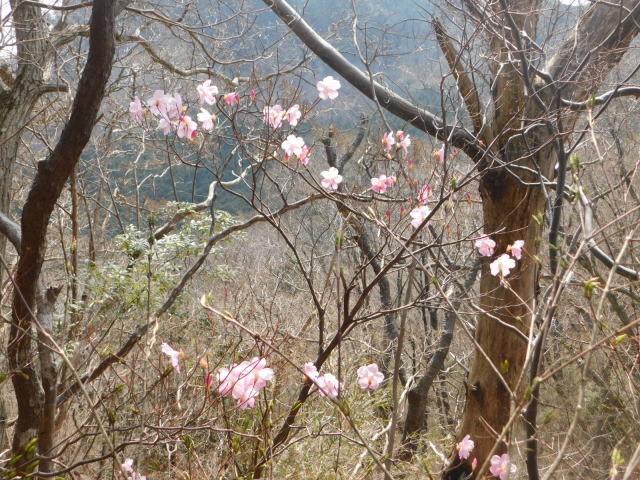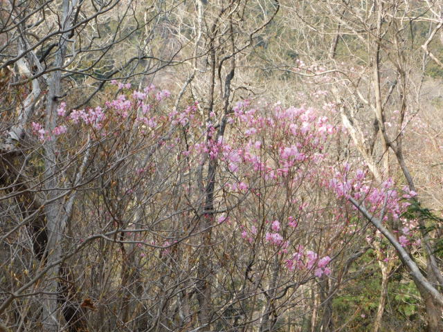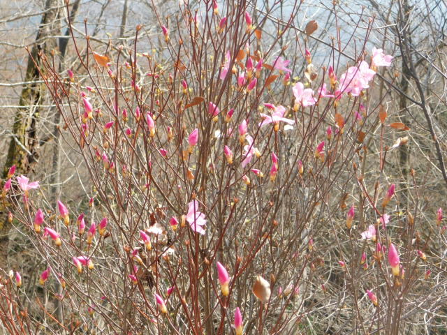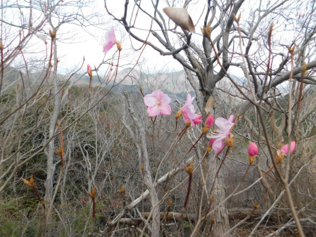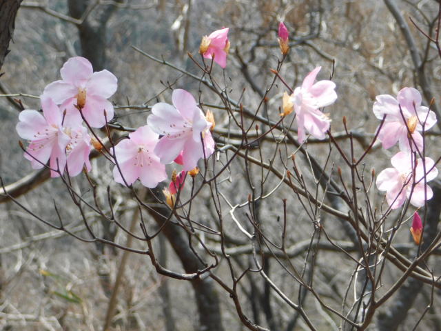 の巻き道に通りにくい所があるので、登って来たカタクリ群生地を降り、北コースを降りて広場から中尾根に登ることとした。中尾根にはアカヤシオが咲いていた。中尾根のカタクリ群生地