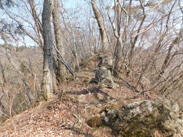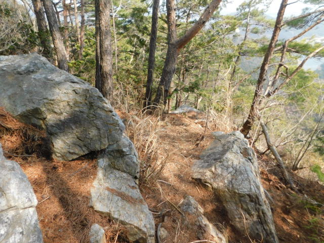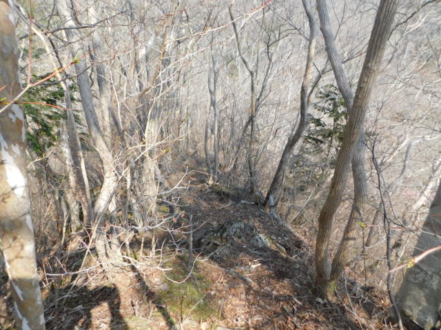 岩と倒木の細尾根を行く。