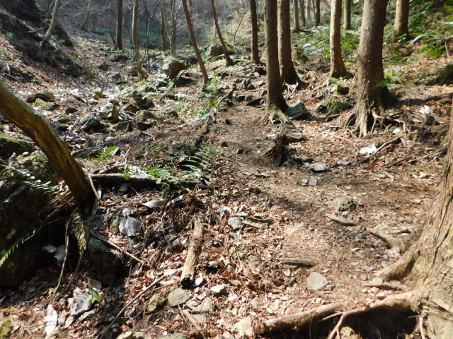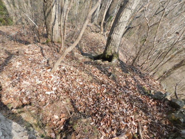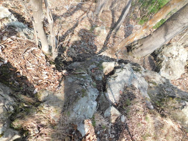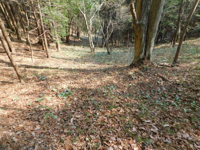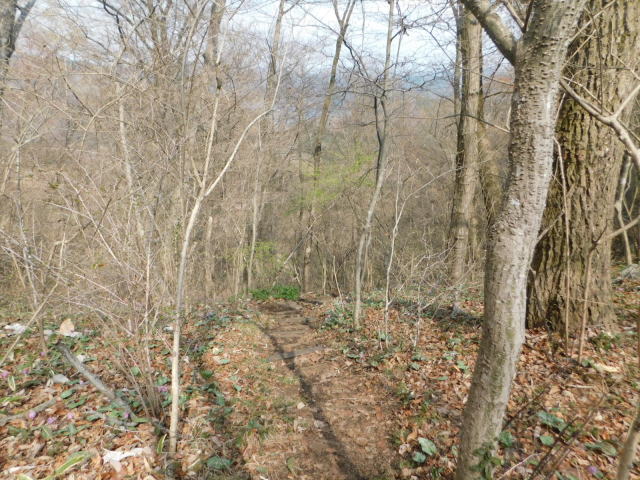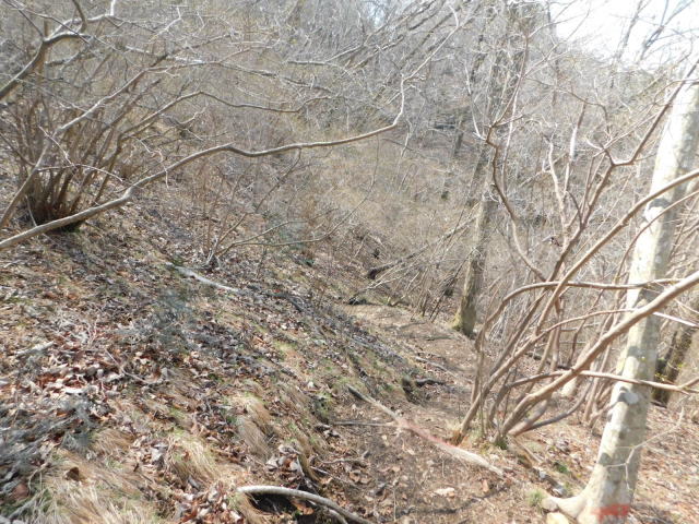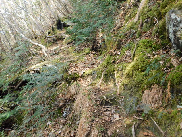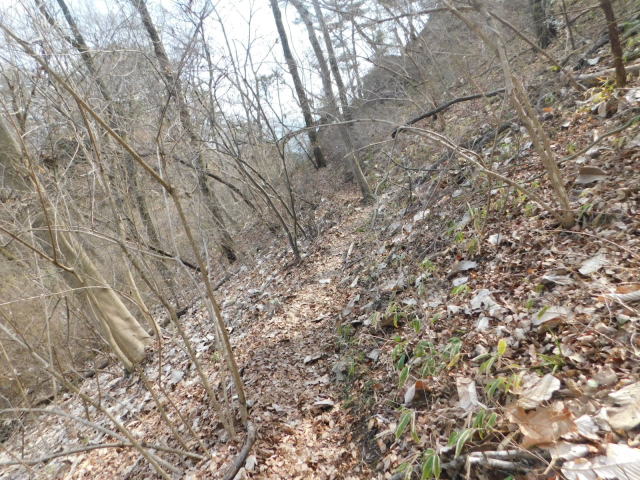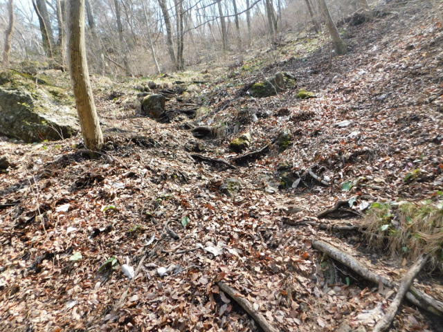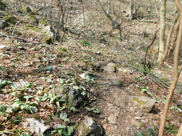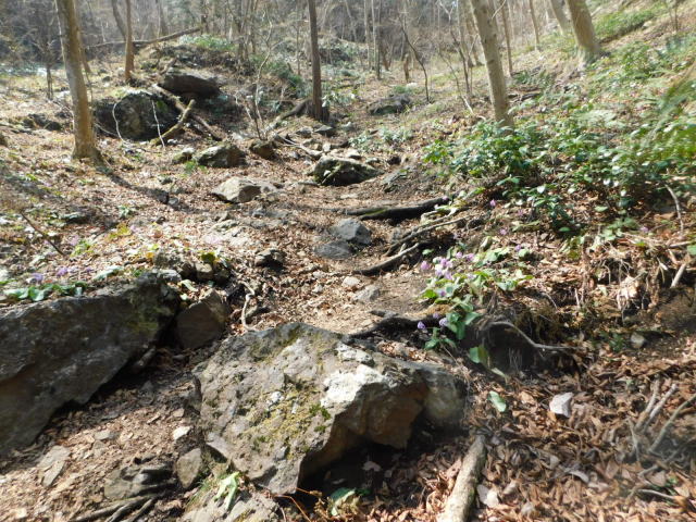 斜面をトラバースして行くと岩の所に着て、その先で北コースが右折するところに出る。北コースが右折するところを真っすぐ登って行くとカタクリ群生地になる。カタクリ群生地を