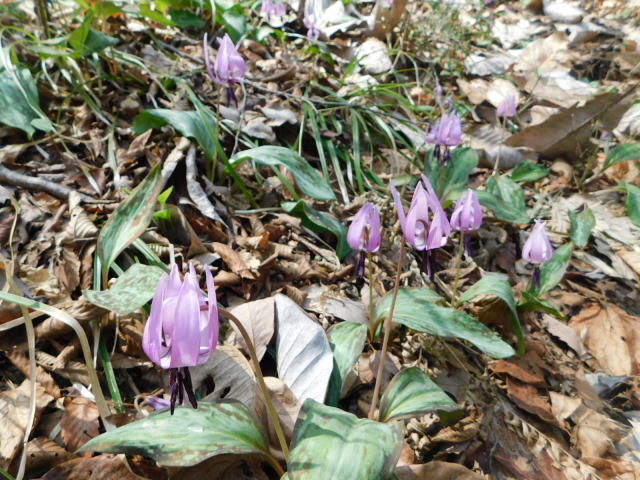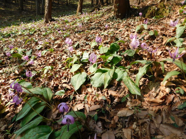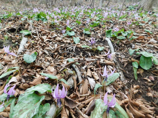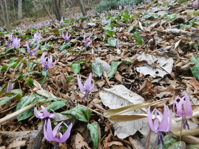 を降りて行く。カタクリ群生地の斜面はカタクリの花に覆われていた。東屋登山口に降り、東屋登山口から道路を駐車場に戻る。午後2時30分の駐車場は5割程の駐車になっていた。