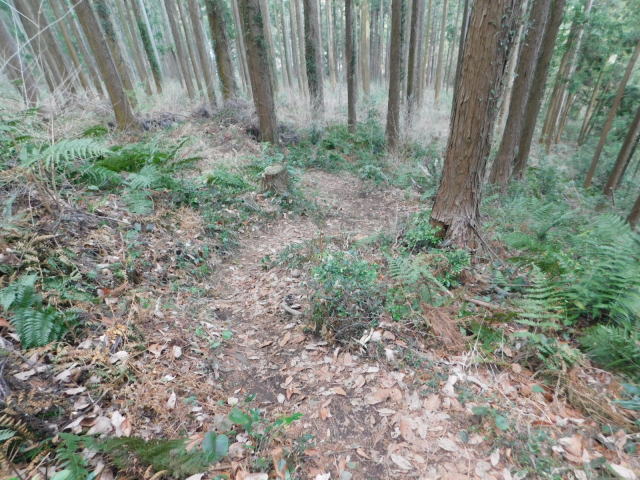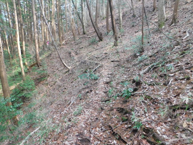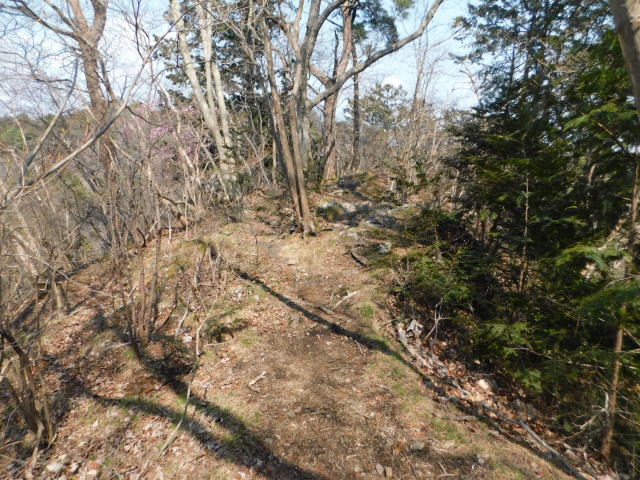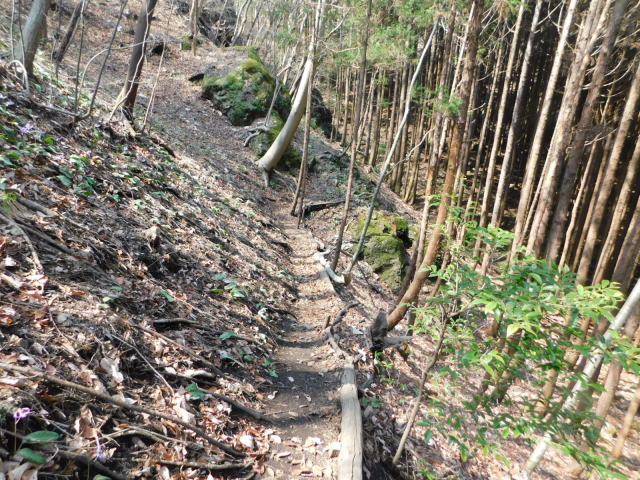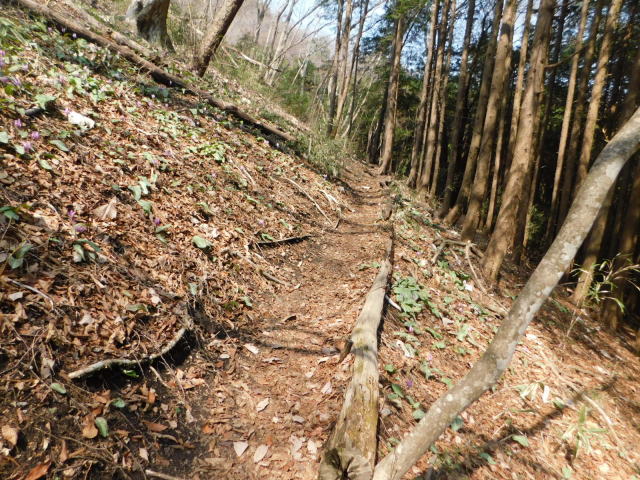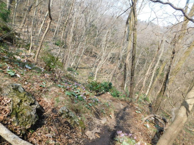 細尾根を行ってアカヤシオを眺める。細尾根の先を降りて行く。急斜面を降りて斜面をトラバースする道に出る。針葉樹の斜面をトラバースして行くとカタクリ咲く斜面に出る。さらに
