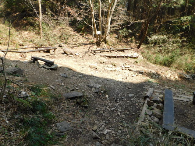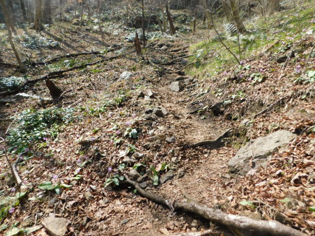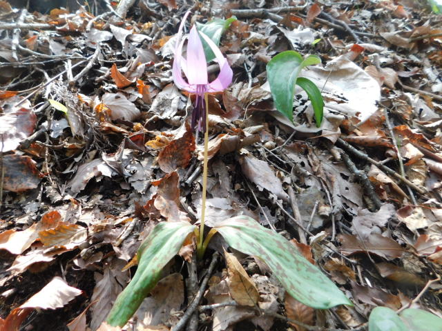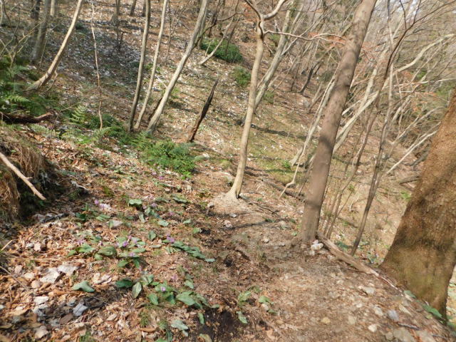 沢沿いの道を行き、白い標柱のある所で左に行くが、ここには道標が無い。針葉樹林の道を行くとお花畑に着く。お花畑にはカタクリが咲いていた。お花畑は右側を登って行くが
