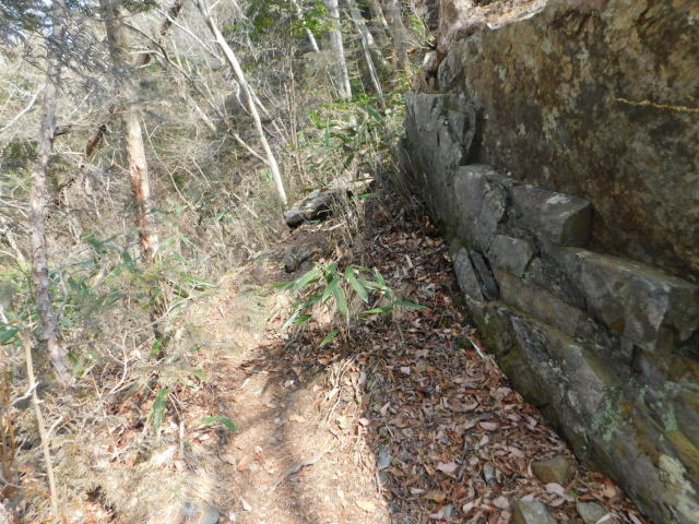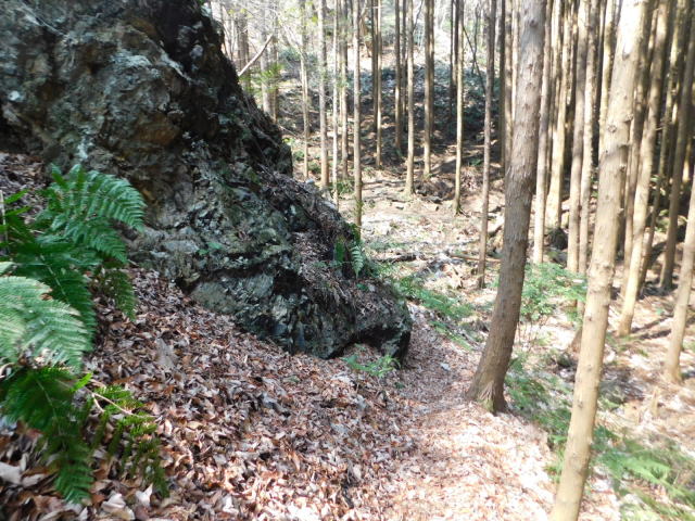 は傾斜が緩くなり登りやすくなる。尾根を登り急斜面の道と合わさると、岩の多い登りになる。登って行くと大きな岩の所に着く。この岩の左側を登山道は行くが、岩の右側を行くと
