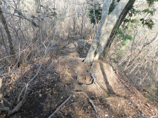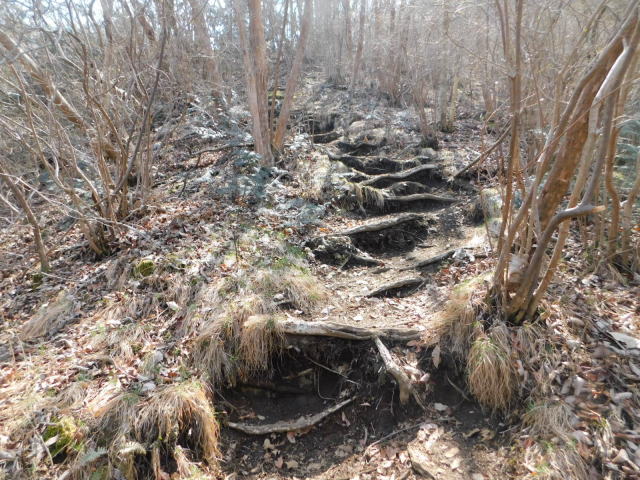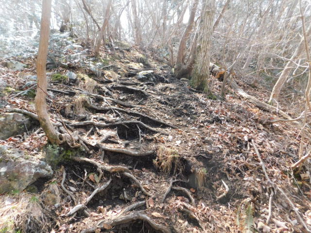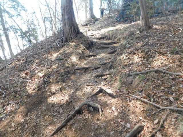 古賀志山頂へは木の根の斜面。