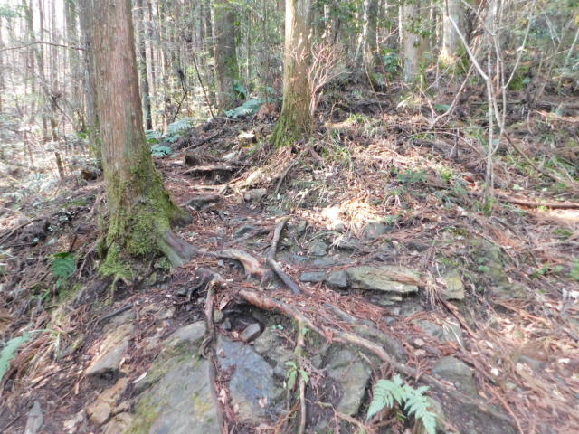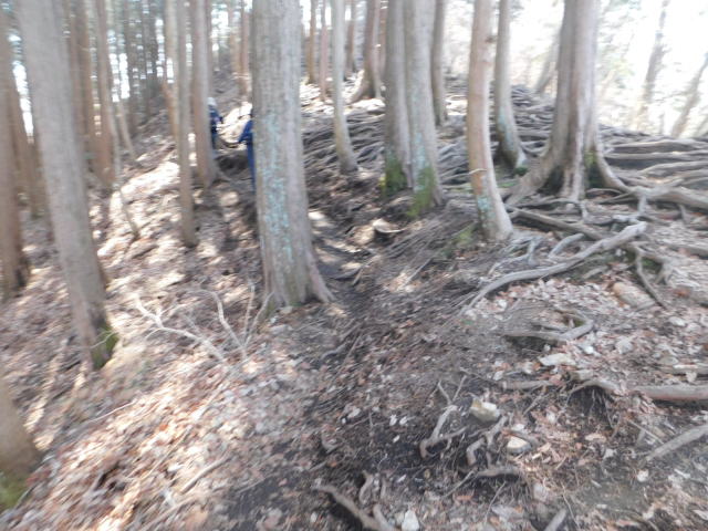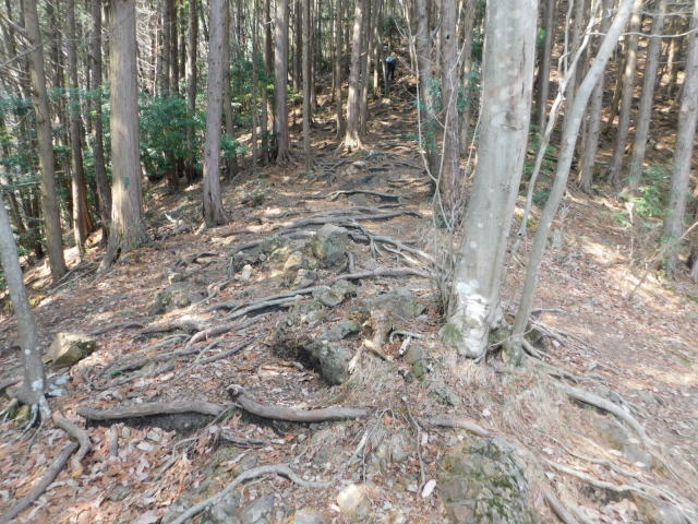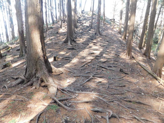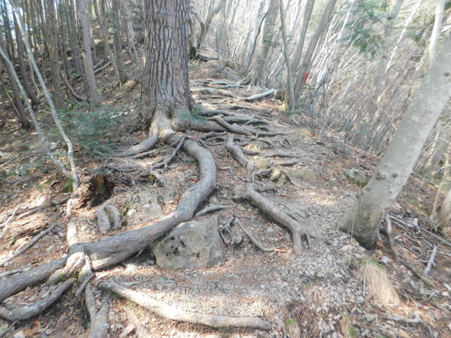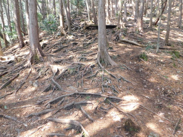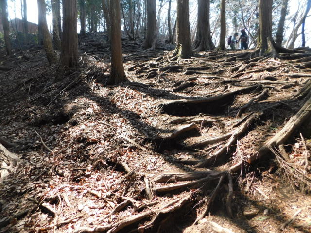 木の根の斜面を登って行く。
