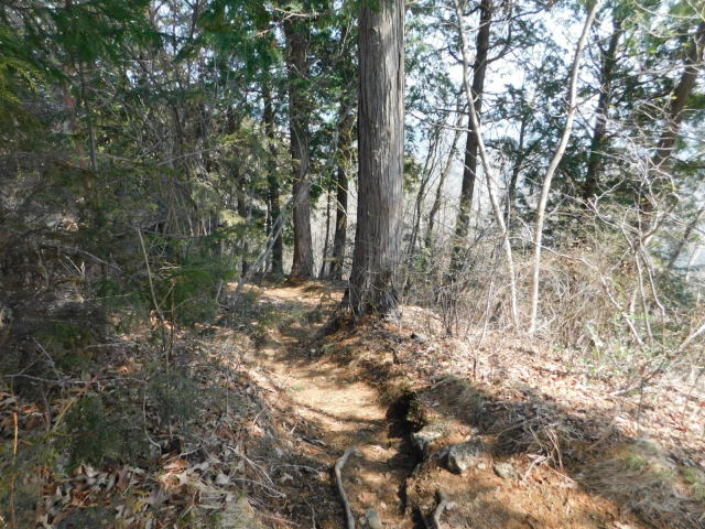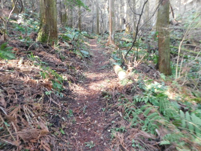 針葉樹林の斜面をトラバースする道に出る。