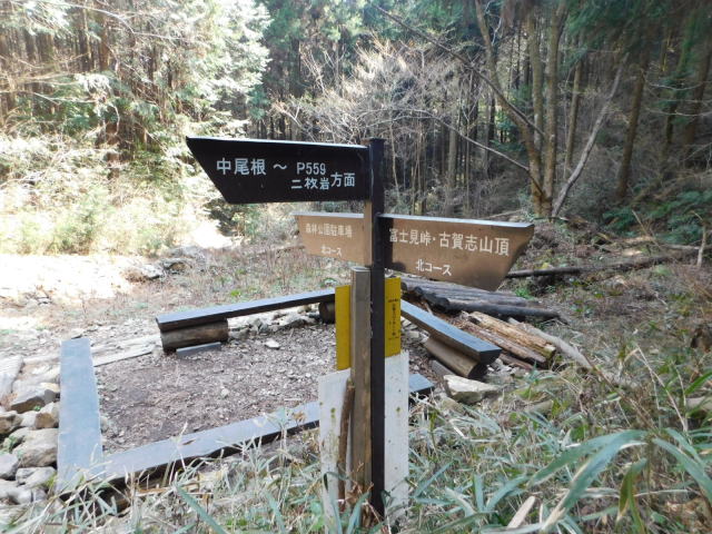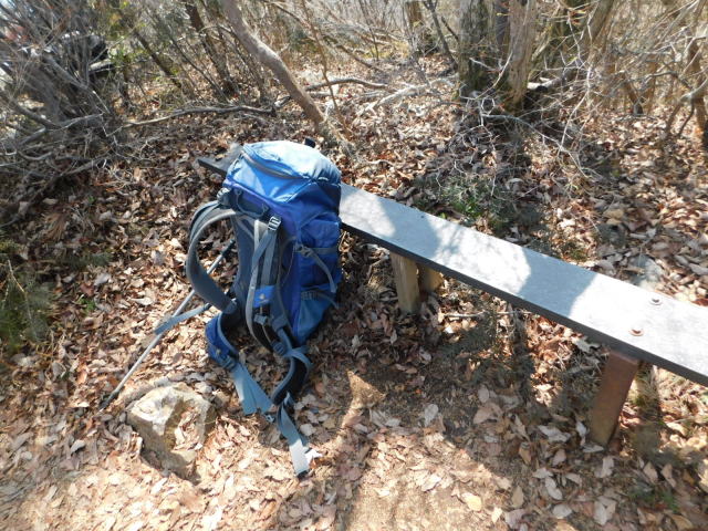 広場のベンチ。 広場の道標、中尾根に行く。