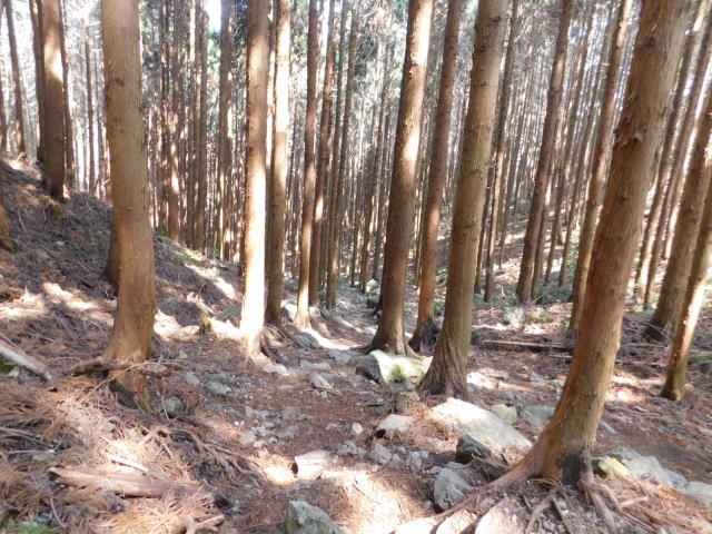 針葉樹林の斜面を登る。