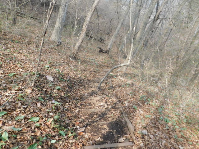 カタクリ咲く斜面の小さな階段を降りて行く。